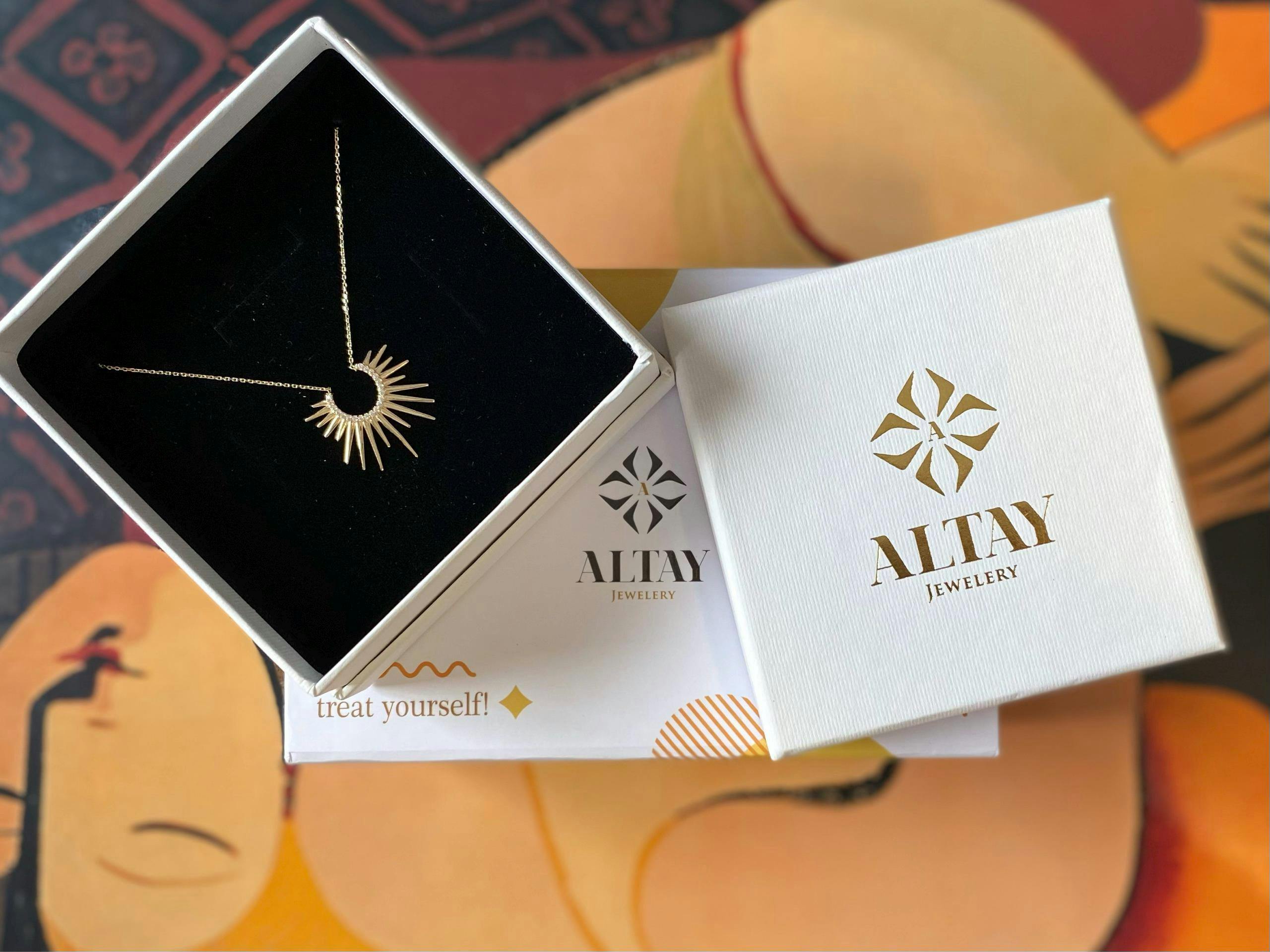 This 14K Gold Sunburst Necklace is suitable gift for girlfriend, mom and her. You can even buy as a birthday gift for your friends or anniversary gifts, If you want to add a special note we can write for you and put to inside of package.